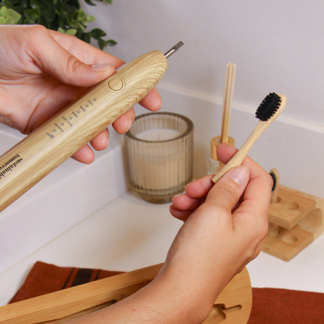 With it, you get one bamboo head carved from the fastest-growing plant on Earth (bamboo) and with soft bristles made of castor bean oil.